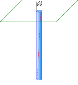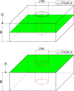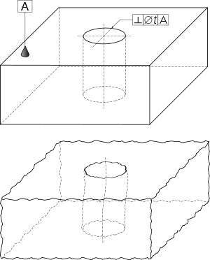 Reste à définir les orientations acceptables de l'axe comparé au plan. Pour cela, on prend la normale au plan, et on construit un cylindre ayant pour axe cette normale, et ayant pour diamètre la tolérance, indiquée en millimètres ; c'est la zone de tolérance (ZT) . L'alésage est conforme si l'axe du cylindre parfait associé peut être positionné entièrement dans cette zone de tolérance.
